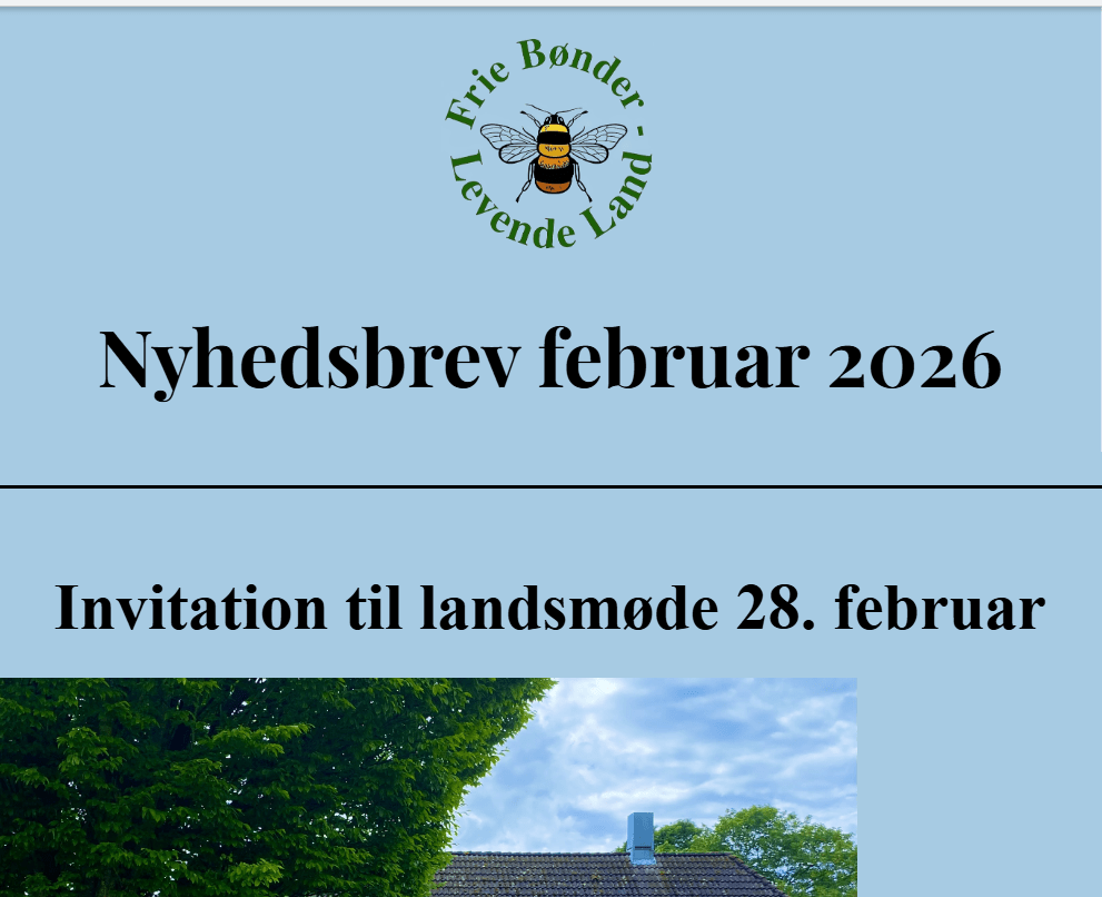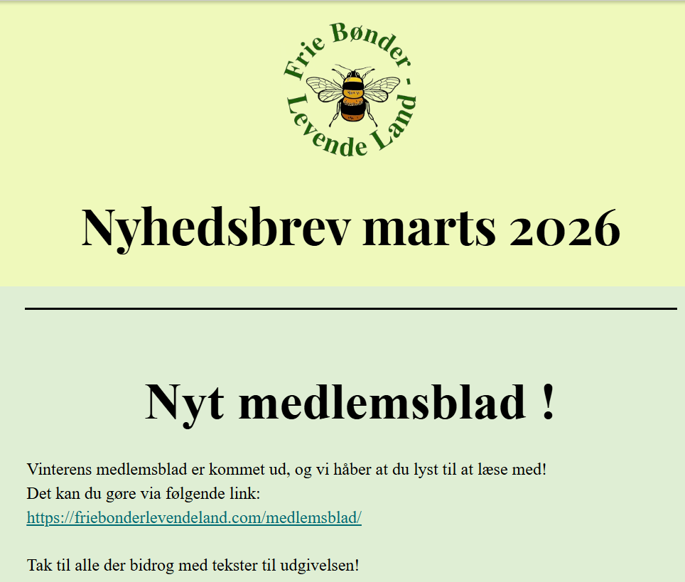 Her kan du læse Frie Bønder – Levende Land’s månedentlige nyhedsbreve. Meld dig ind i foreningen for at modtage dem hver måned direkte på mail, i en flottere version der ikke har taget skade af konvertering til pdf-format(;